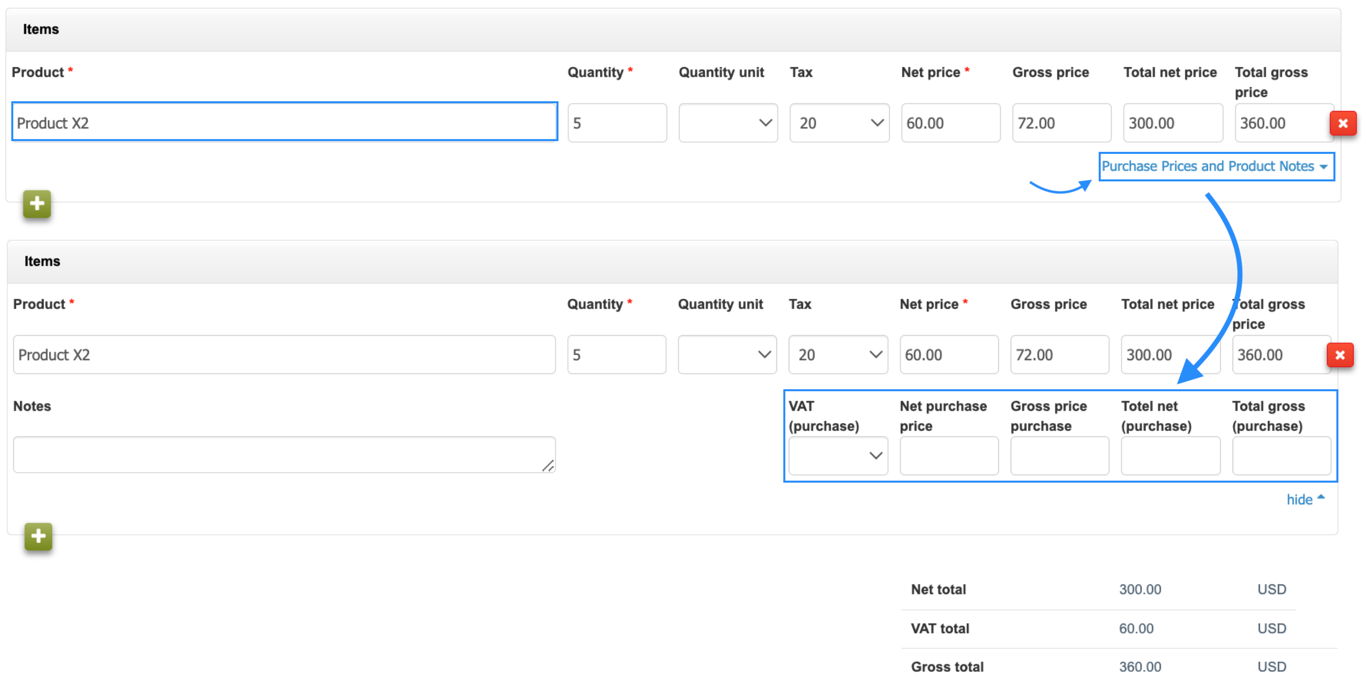 - By expanding the linked Purchase Prices option, you can also enter the current purchase price on this document.