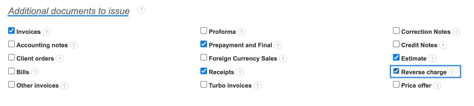 To issue invoices under the reverse charge procedure, you must activate it as a document type within your account settings. To be able to issue revere charge invoices:
