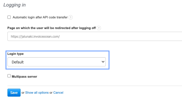 A user who wants to log in to InvoiceOcean is redirected to the address specified in the Multipass URL settings.