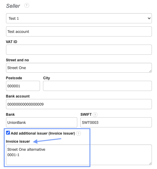 In the system, there is the option to add a different correspondence address or additional issuer details under the seller's information.