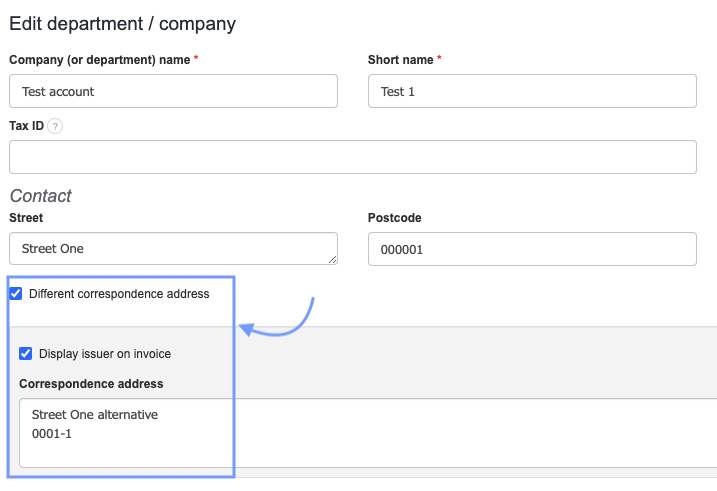 To define the details to be displayed under the issuer on the invoice, go to Settings > Company/department, edit the selected company or department, and choose the field Different correspondence address. Then enter the data into the displayed field. We can also define whether the details will be private or displayed on the invoice by checking the box Display issuer on the invoice.