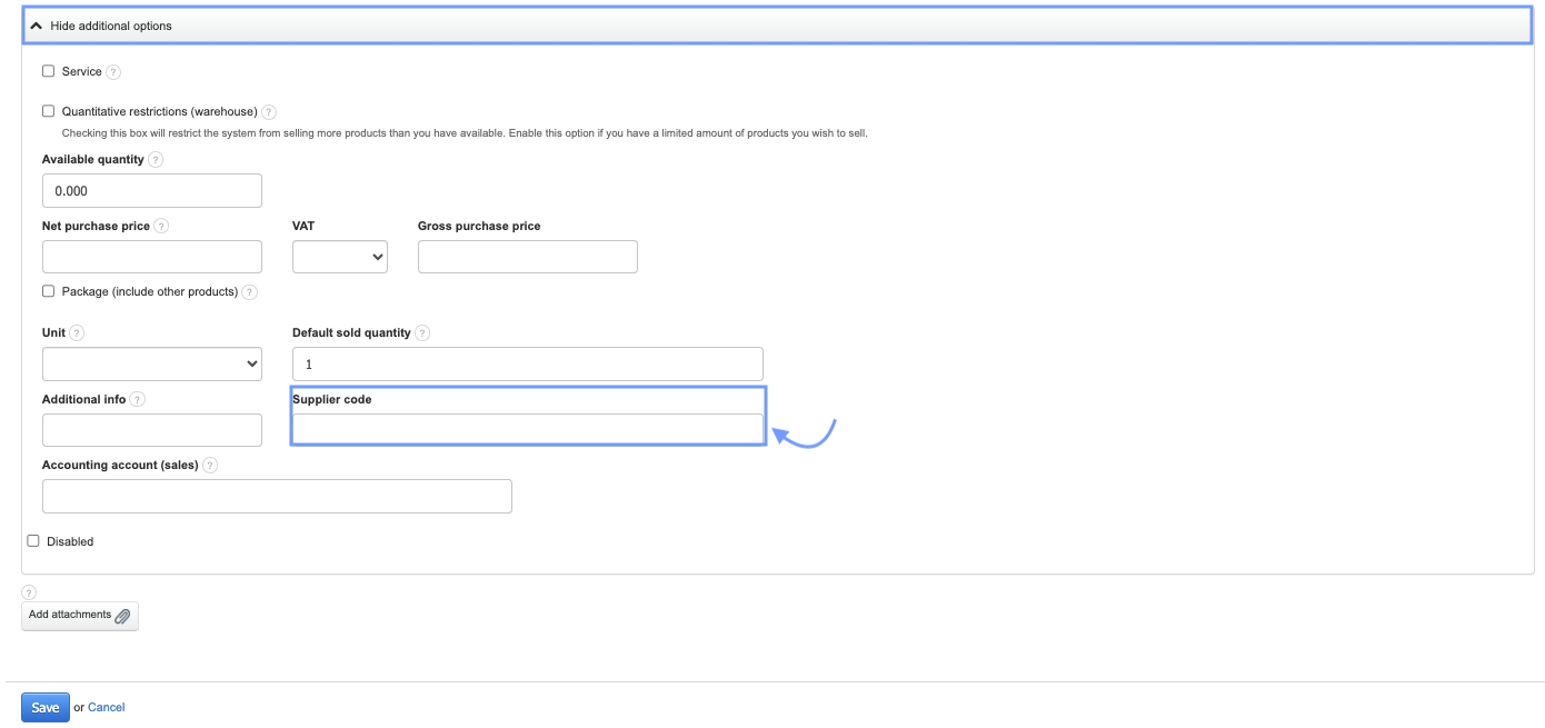 If the product has its own supplier code from which you purchase it, you can enter it in the product card. To do this: