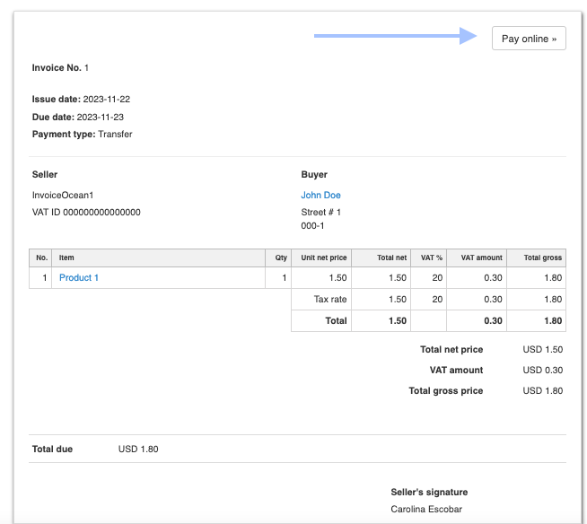 4. In the top right corner of the invoice, a button will appear that will redirect your contractor to the payment.