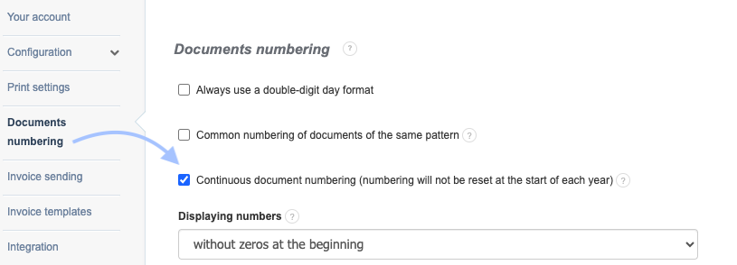 To set this option on your account, go to the Settings > Account Settings > Documents numbering menu and check the Continuous Document Numbering box: