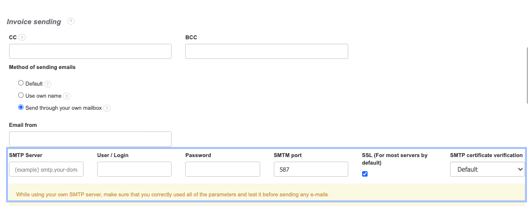 However, if your mail server does not require the SSL option to be enabled for sending through your own server, you can uncheck this checkbox. After configuring your own server, we recommend testing the correctness of the settings by sending a test email.