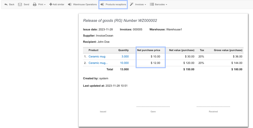 In our example, 13 pieces of ceramic mugs were sold. The mug was received into the warehouse several times at different purchase prices. This breakdown into 2 products with different purchase prices is visible on the RG document. Clicking on Product Receptions would reveal two associated Acceptance of goods documents.