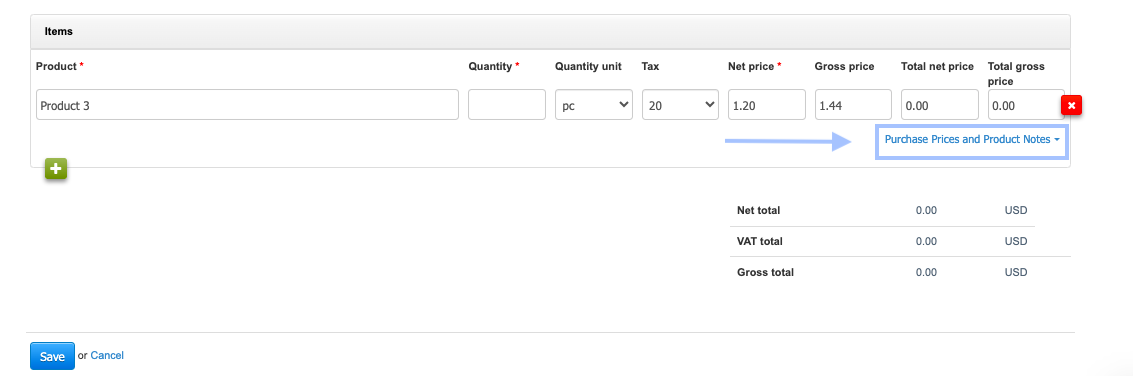 Below the selling prices of each item, you will find the phrases Purchase Prices and Product Notes.