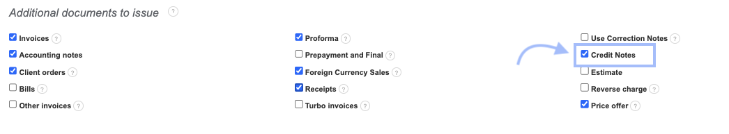 To issue a Credit notes, you first need to activate this type of document in the system. To do this, go to Settings > Account Settings. In the Additional documents to issue section, check the Credit Notes box. Confirm the changes by clicking the Save button at the bottom of the page.