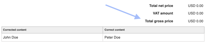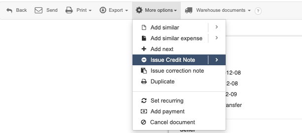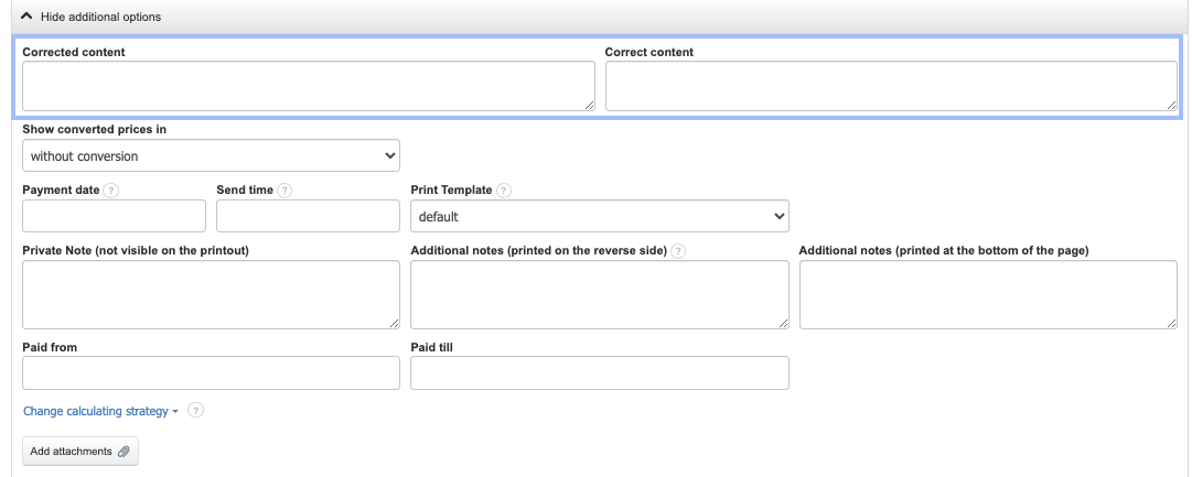In the Credit Note form, you will find additional fields: corrected content and correct content. They are visible when expanding the See more options section or hiding additional options if this section is already expanded.