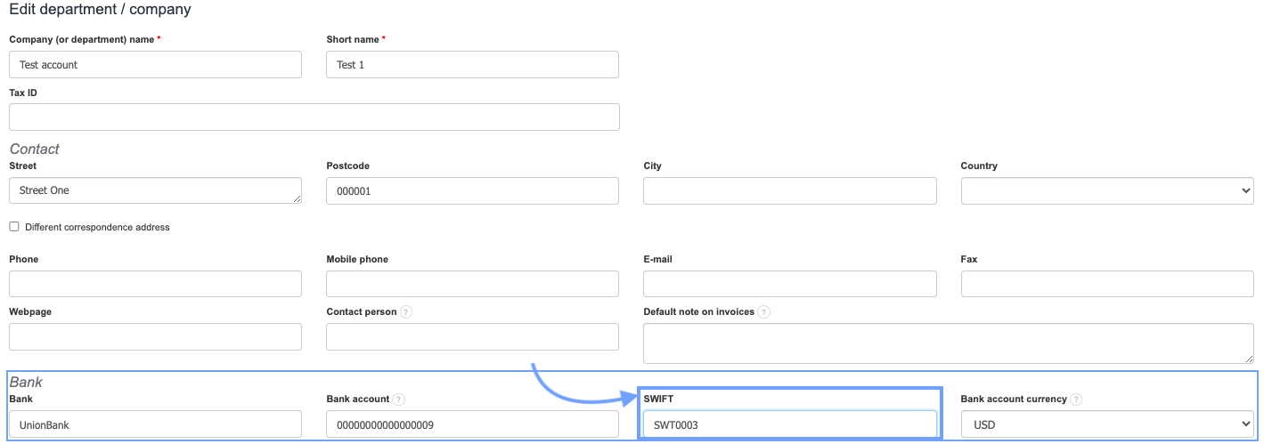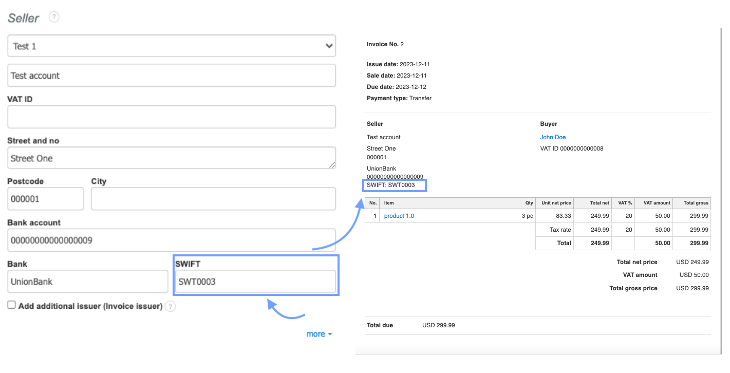 In the Seller's information on the issued document, basic details such as the name, address, or identification number are visible. In the company's details, you can also add banking information such as the bank name, bank account number, its currency, and the SWIFT code. The SWIFT code is an international identifier for a financial institution participating in the SWIFT system. In this article, you will learn where to enter the SWIFT code so that it appears in the Seller's information on the invoice.