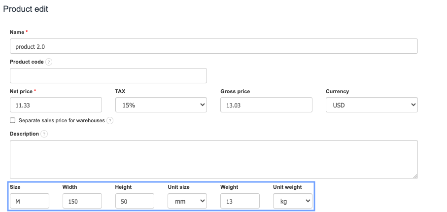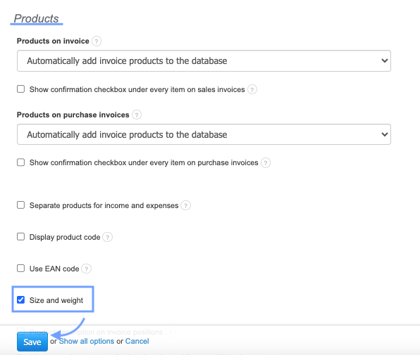 One piece of information you can input into the system is the size and weight of the products. To add this information, first go to Settings > Account Settings > Configuration > Products and check the box Size and Weight.