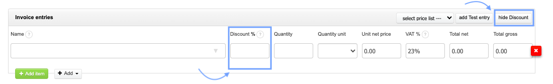 The Discount field is used to add a discount to invoice items. The values that can be entered in the field are numeric values, meaning by default, the percentage value of the discount. To make the Discount field appear on the invoice, press the button add discount in the upper right corner of the item's table. The discount column will appear, and the "add discount" button will change to "hide discount". The discount added to the document can be entered as a percentage discount or as a discount amount. This field is activated from Settings > Ways of calculation > How to calculate discount > ability to change the discount type in document editor. Then it will appear as follows on the invoice: