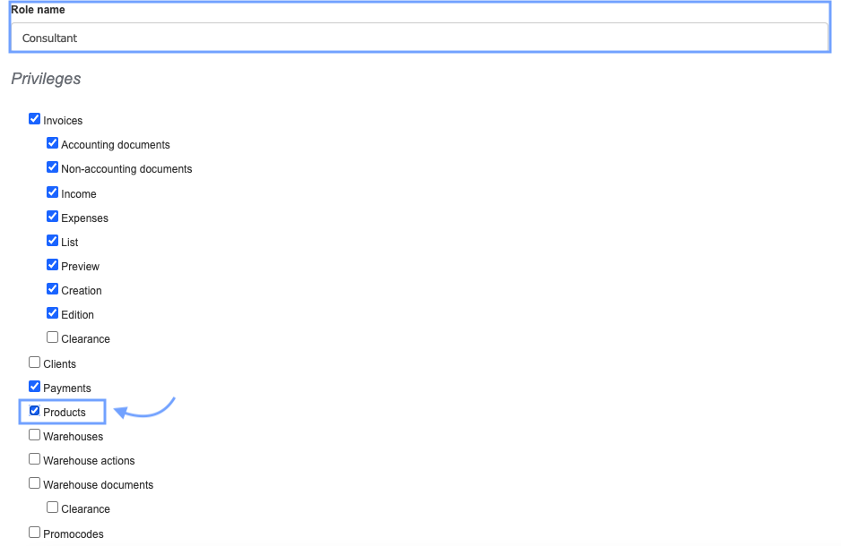 3. Fill in the Role Name field, 4. in the Privileges section, check the checkboxes next to the options that the user should have access to. 5. To grant access to the product database, check the checkbox next to the Products option,