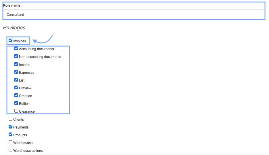3. Fill in the field Role name, 4. in the Privileges section, check the checkboxes for the options to which the user should have access, 5. to grant access to invoices and their management, check the checkbox next to Invoices as well as those options related to documents to which the user should have access to.
