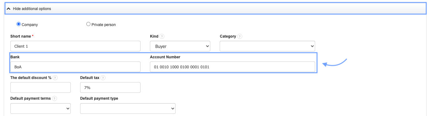 When creating a client in the database, you have the opportunity to specify not only basic data such as name, Tax Identification Number (VAT ID) for companies, or address. In addition to this, as part of the more options, you can specify the type of client, set default discounts, terms, or payment methods. In this entry, you will learn where to enter the bank and account number of your contractor in the client's data.