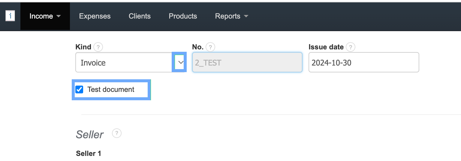 To create a test document, simply create a new document (Income > Add new invoice), choose the type of document, and check the Test document box located at the top of the document creation form.