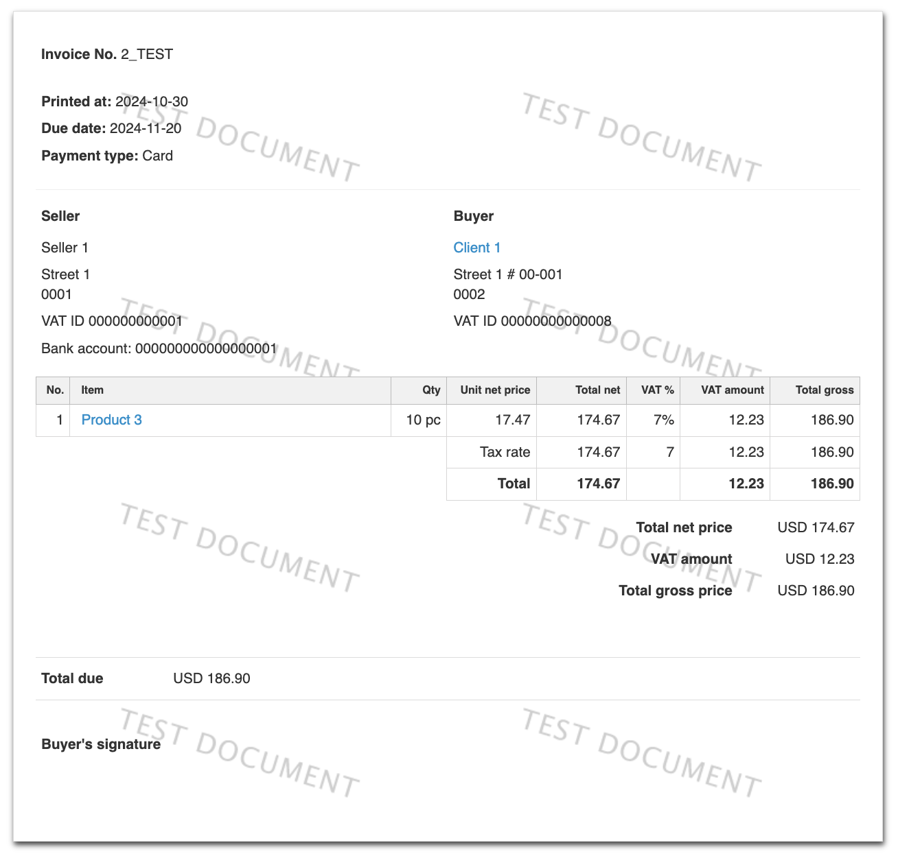 This Test function has been developed not only to facilitate your navigation and learning through the system but also, and more importantly, to clearly distinguish your real documents and payments from those created for testing purposes. This could be important in case of an audit by tax authorities.