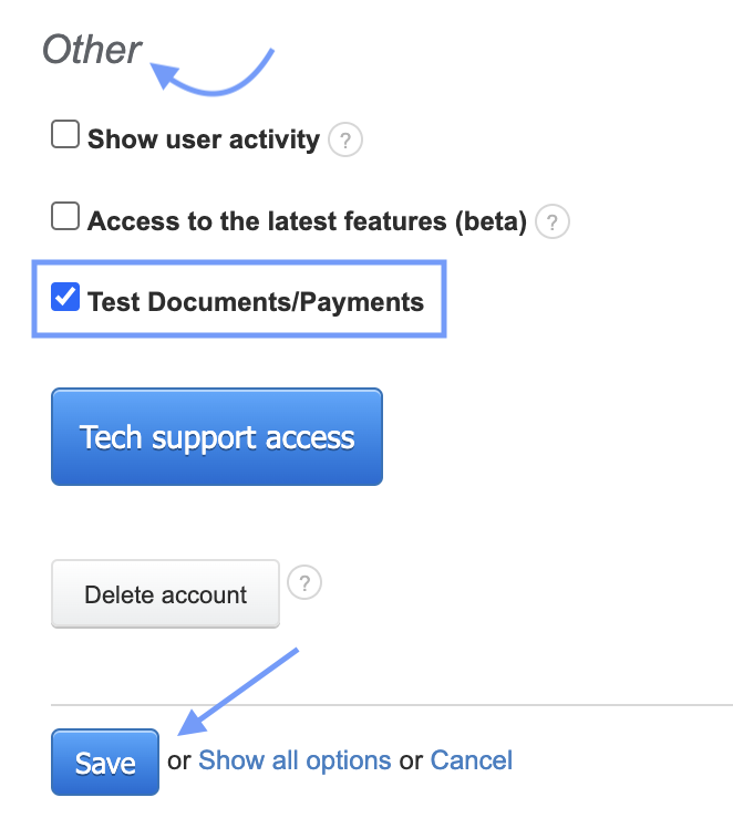 - To activate the Test option, check the Test Documents/Payments option in Settings > Account Settings > Your Account (under the Other section), and don't forget to Save.