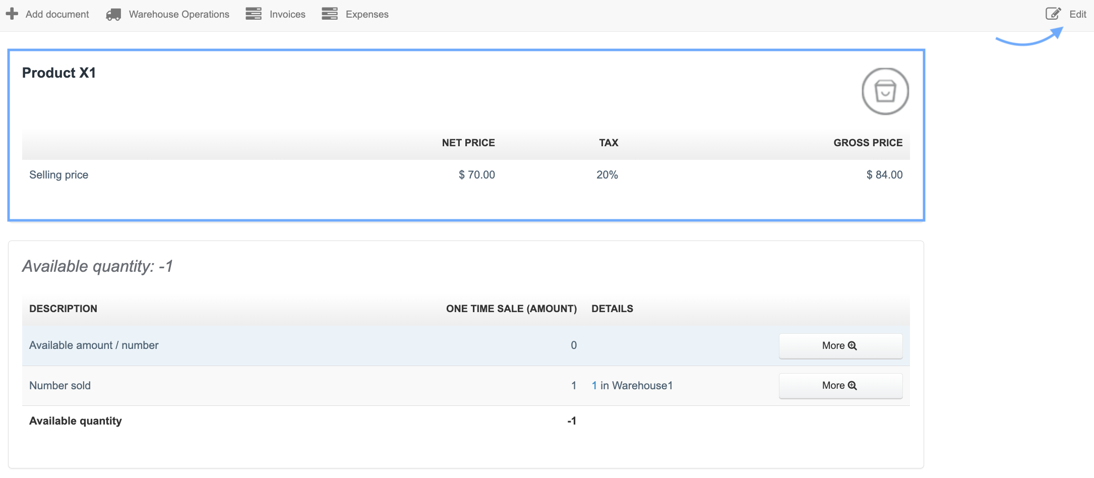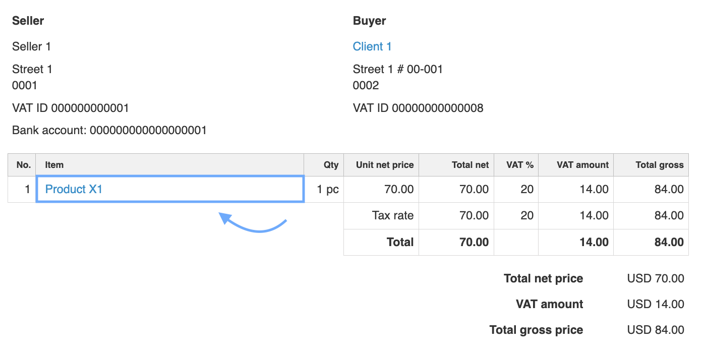 After saving the document, the system will display the invoice with the new product, which was added to the product database on your account during the save process. The product name serves as a hyperlink, and clicking on it will take you directly to the product's card. This confirms that the product has been successfully added to the database.