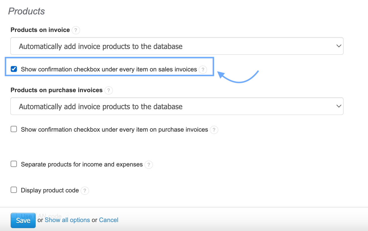 The active option Automatically add invoice products to the database also enables the feature to choose whether to add a product during invoice creation. To enable this choice when adding products from sales invoices, go to the product settings, check the box next to Show confirmation checkbox under every item on sales invoices and save the changes.