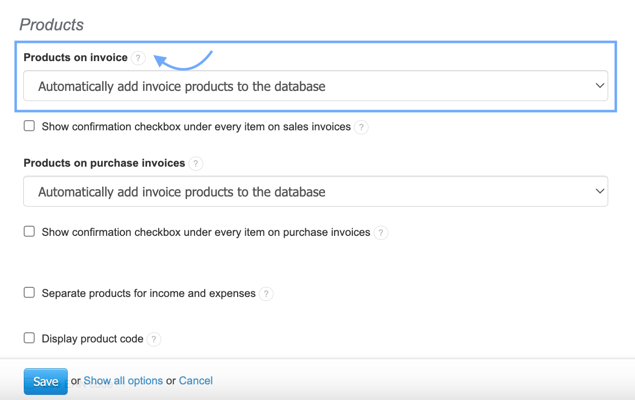 3. If a different option is visible in this field, click on it and change the setting (if the option Automatically add invoice products to the database is already selected, no changes are necessary),
