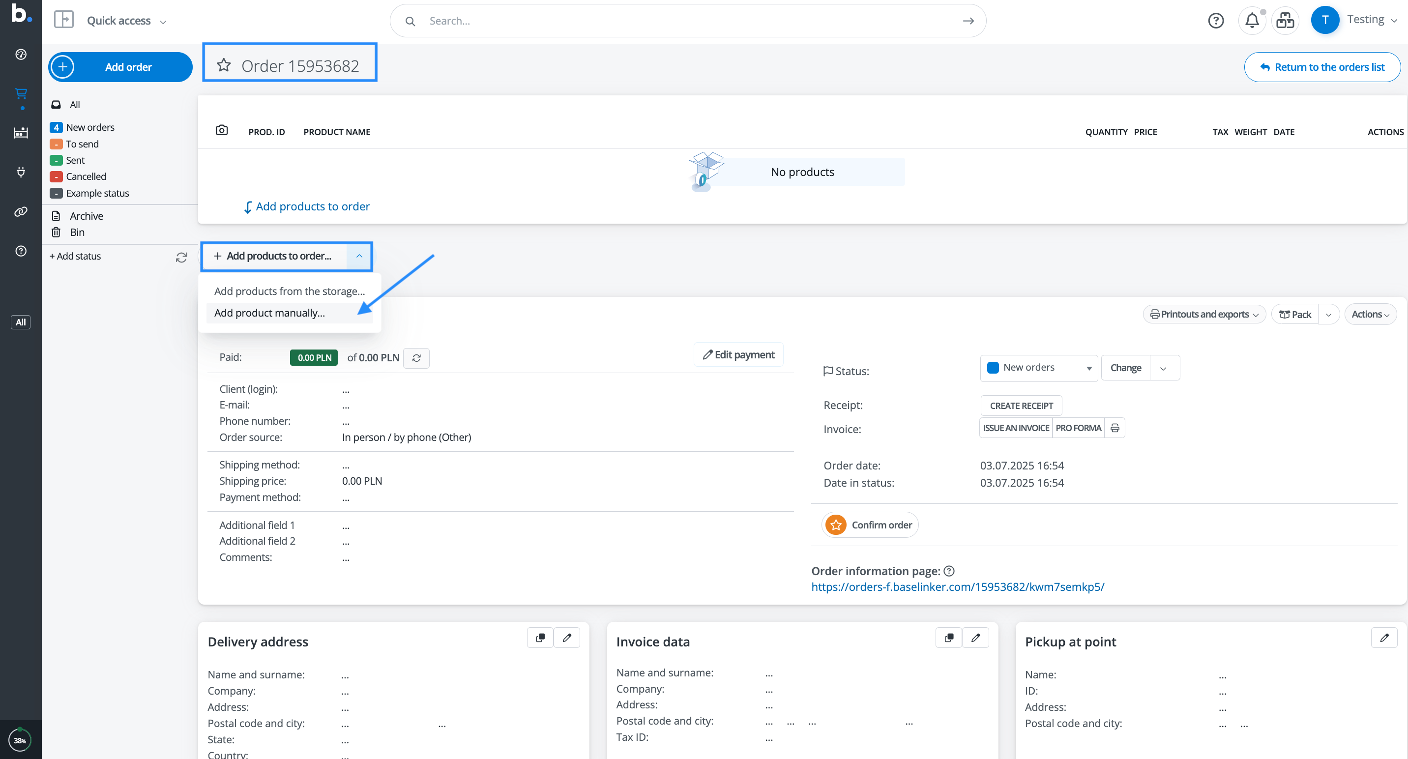 - A new form displaying the order number will appear. If you have not entered any products, please use the option Add products to order > Add products manually,