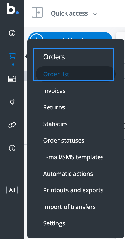 - Go to the Base main menu and select the shopping cart icon (Orders) from there select the option Order list,