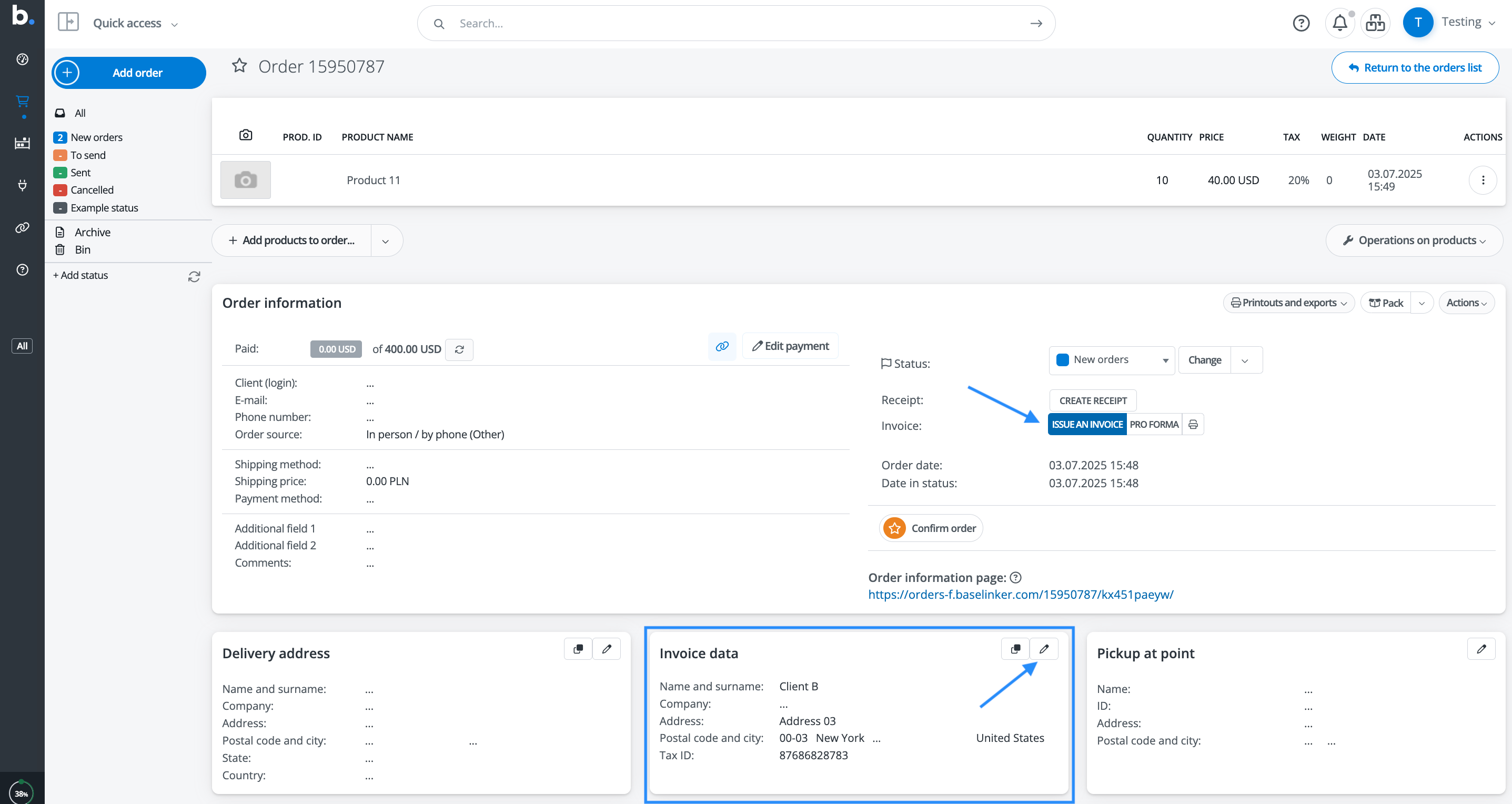 1. Place an order in your e-commerce store. The order information from your e-commerce store is sent to Base.com via API according to your settings. The order will be displayed in your Order list menu in Base.com.