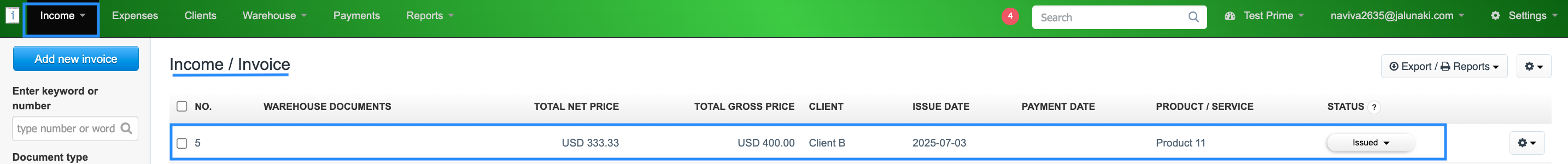 4. Check in your InvoiceOcean account the new Invoice in Income > Invoice.