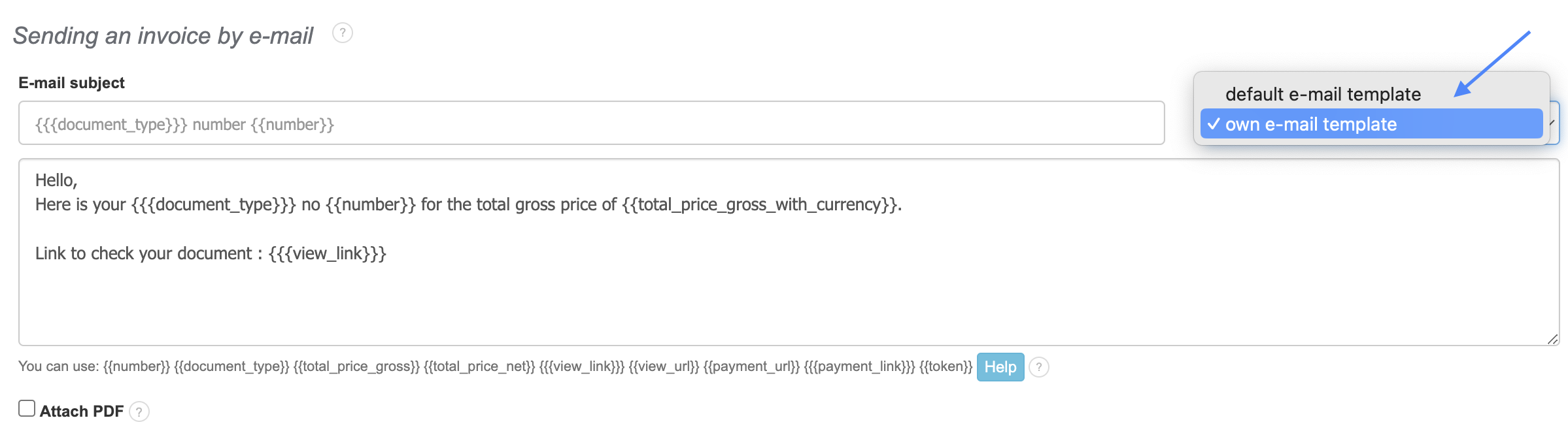 - Change the option "default e-mail template" to "own e-mail template" in the Email template kind section