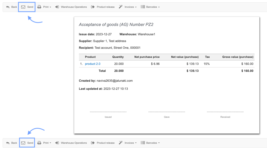 The form for sending warehouse documents via email is activated from the preview of the warehouse document. Click on the top menu Warehouse > Warehouse Documents, then open the document you want to send. From the top/bottom toolbar on the warehouse document preview, select the Send option.