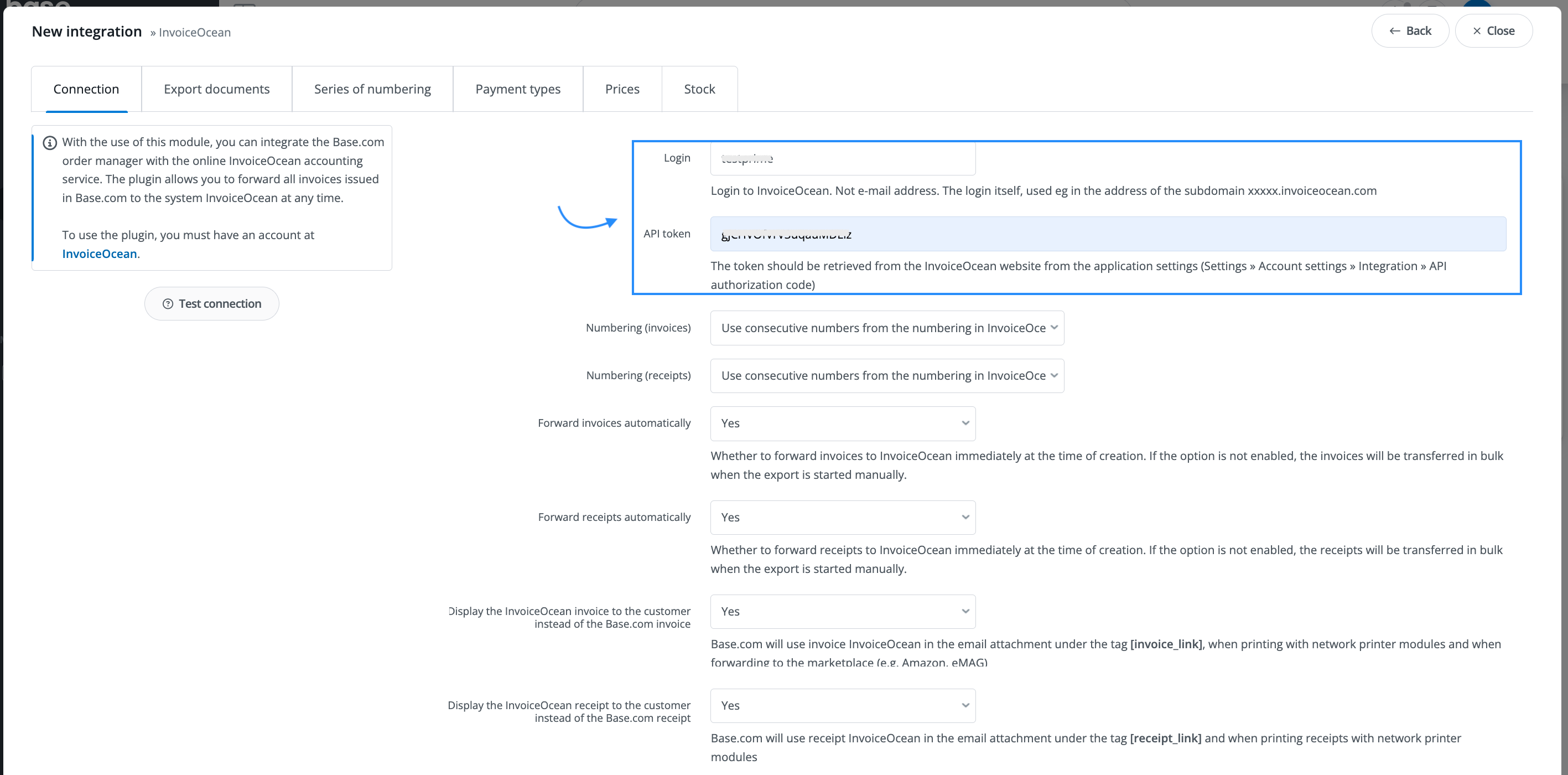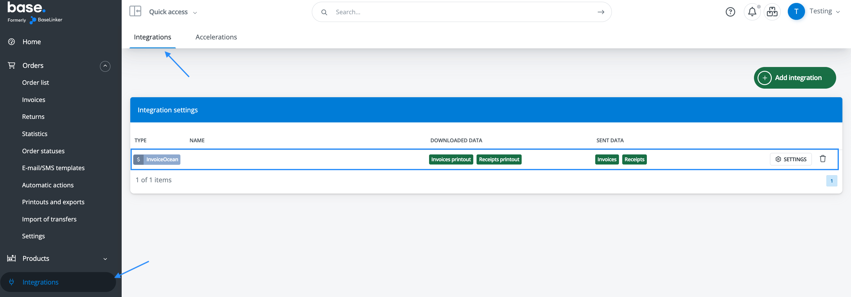 1. In your Base.com main menu, find the Integrations tab > Add Integration 2. In the search tool, type in InvoiceOcean to integrate with us,- In the field Numbering (invoices), select the option Use consecutive numbers from the numbering in InvoiceOcean. This option will allow you to keep the consecutive numbering stablished in your InvoiceOcean account when exporting your invoice.