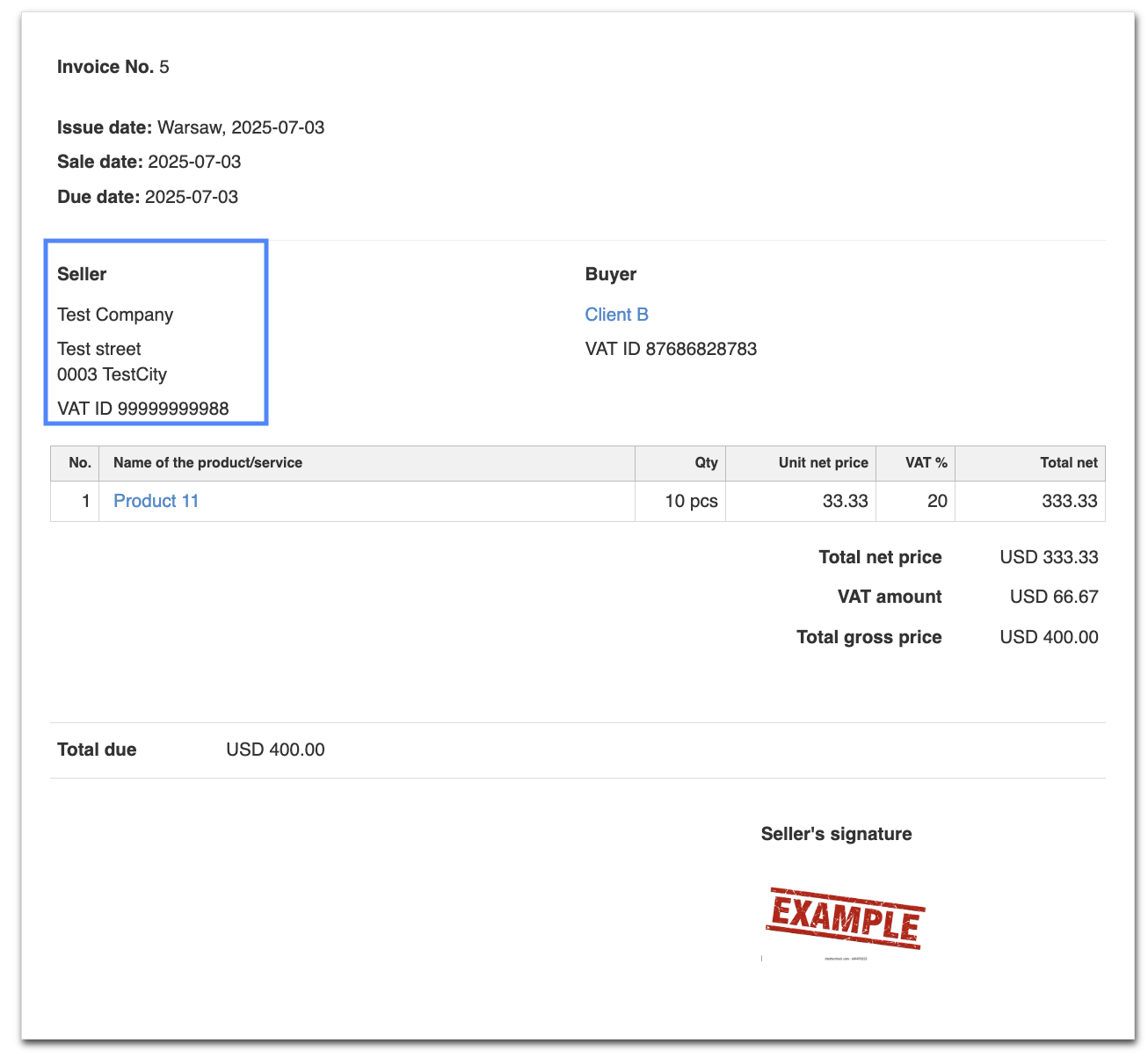 2. Edit the recipient's information in the Invoice data field. Add the required information and Save. Then click on the blue button Issue an Invoice,