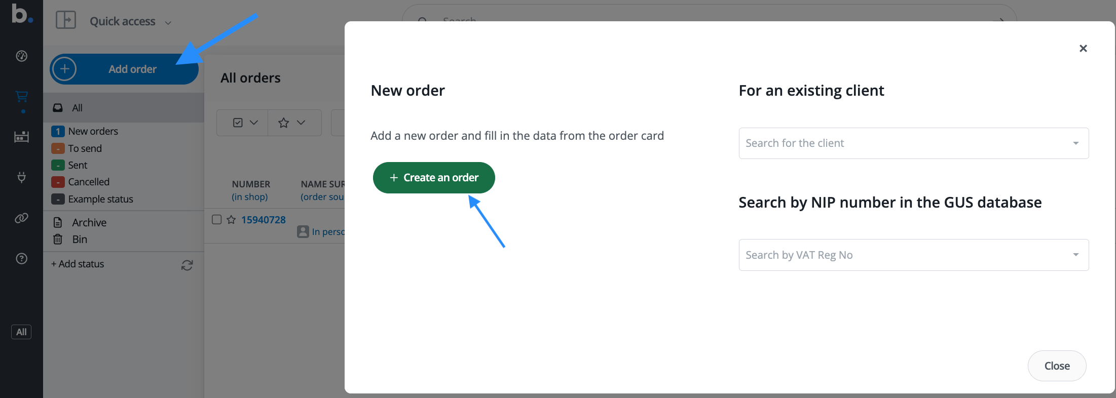 - Select the blue button Add order. A window will pop up. click on the green button Create order,