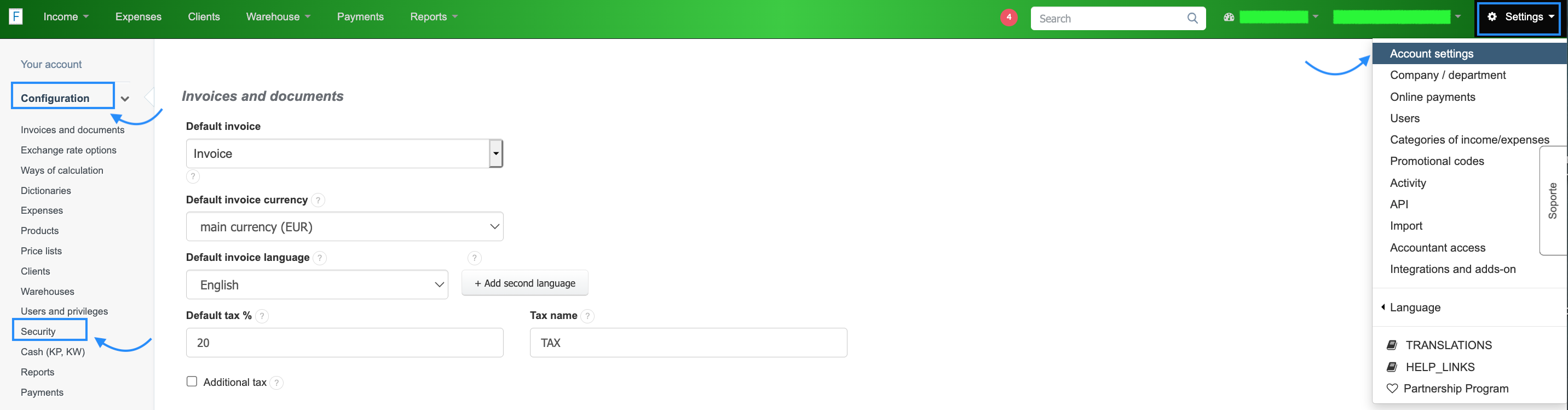 1. Go to Settings > Account Settings > Configuration > Security