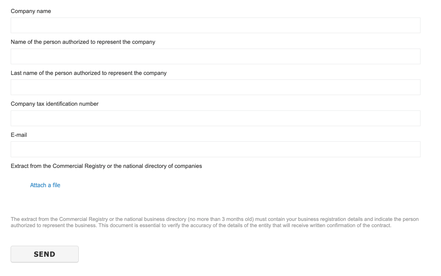 You must also attach a scan or PDF file of a current extract from the National business directory downloaded from the relevant official registry website (not older than 3 months). This document should contain the company’s registration details and is required to verify the accuracy of the information of the entity to which the written confirmation of the conclusion of the agreement will be issued.