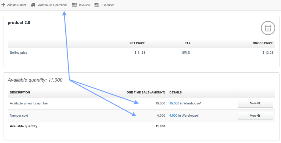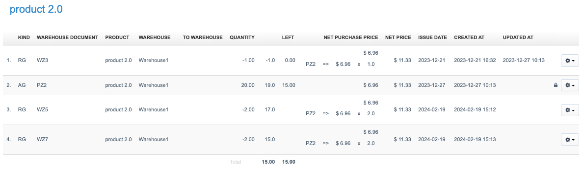 By clicking on the blue-linked available quantity, we can display a list of warehouse documents (warehouse actions) for that specific product in the system. A new feature added to the system is the ability to filter warehouse actions by a specific type of warehouse document.