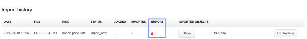 When you click on the number showing the quantity of import errors, detailed information about the error will be displayed. In the case of importing price lists for non-existent products you will see the following error: