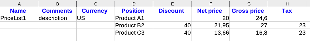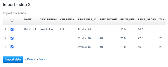 The most common errors in importing price lists result from importing too little data (for example, omitting the price list name or currency in the import file). Before importing price lists, make sure that the products for which you are creating price lists have been previously created in the system.
