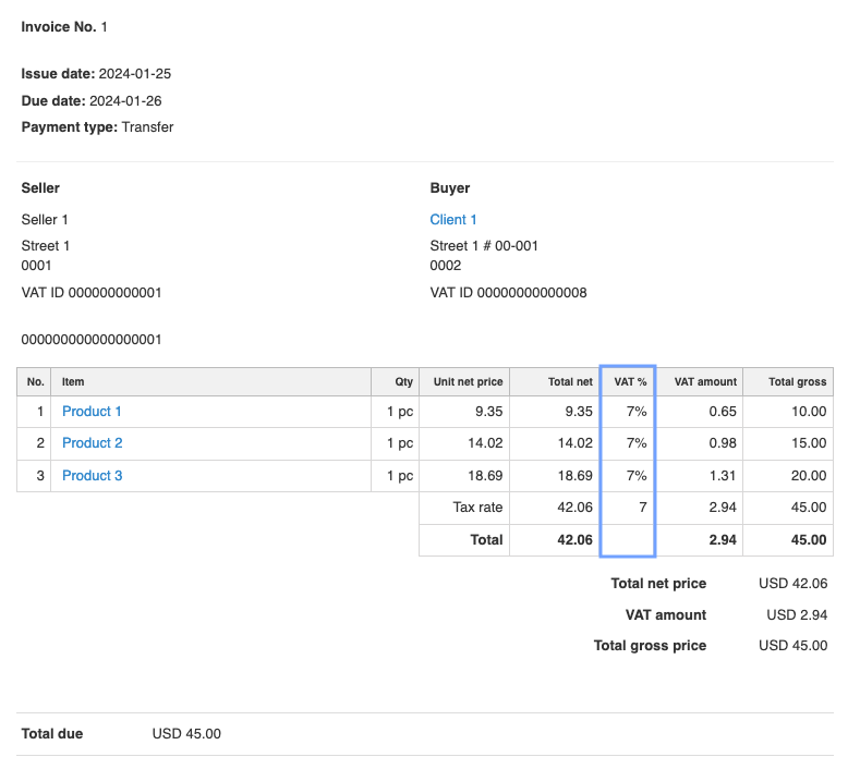For example: if the product itself, in the product card, has a VAT rate of 23%, when creating a new invoice and adding a client with an assigned VAT rate of 7%, all products added will automatically have the tax rate specified in that client's card.