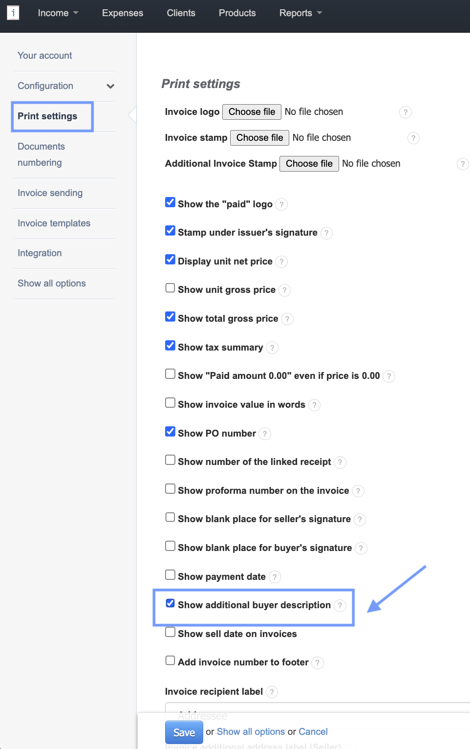 Warning! Selecting the Additional buyer description field in the print settings will show the information placed in the field Additional note that can be added in the Client's card or in the Buyer's Additional note field.