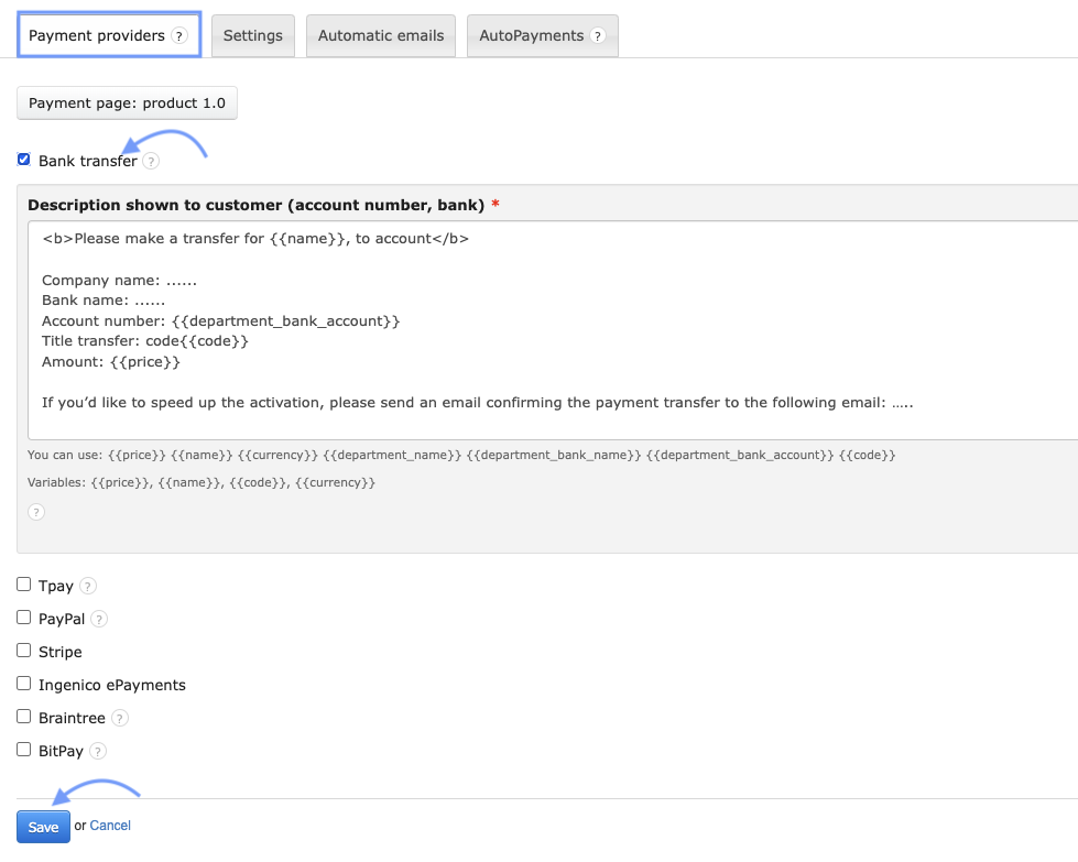 Note: You need to enable at least one of the available payment types. To start testing, it's easiest to choose Bank Transfer. This way, the invoice will display a button that allows customers to make payments via credit card or fast bank transfers within just a few minutes