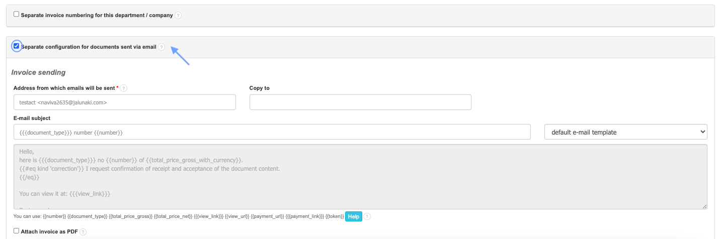Which in turn, allows you to create invoices in a specific language version after selecting a given department and the email will be sent in the appropriate language and from the appropriate email address.