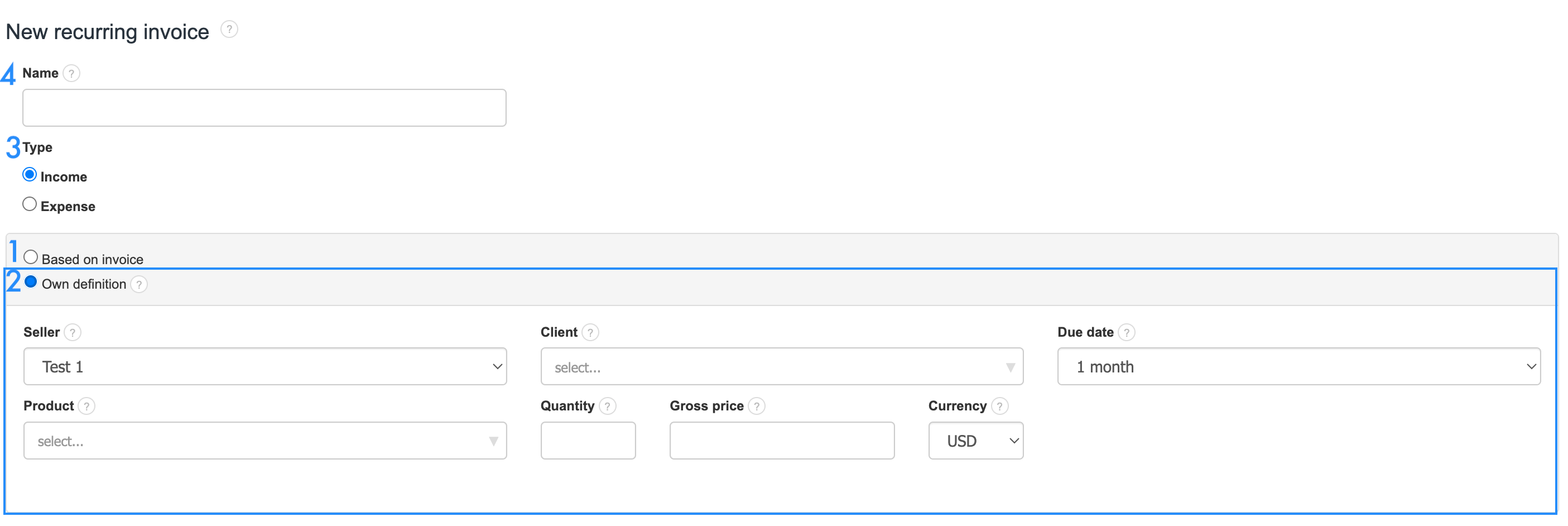 2. Own Definition : Opting for this option provides you with the opportunity to create a sort of "template" of predefined data upon which your recurring invoices will be generated. Own Definition also allows for easy editing of the cycle, unlike the invoice-based cycle, where you would need to edit a sample invoice to change anything in the cycle. To create such a cycle, simply fill in the Seller, Client, Due date, Product, Quantity, Gross Price and Currency fields with the appropriate information, and each subsequent invoice will be issued accordingly. If you have multiple companies in the system, you can specify the Seller. The client list will appear as soon as you start typing in the Client field. Also, indicate the due date, select the product, its quantity, price, and currency.