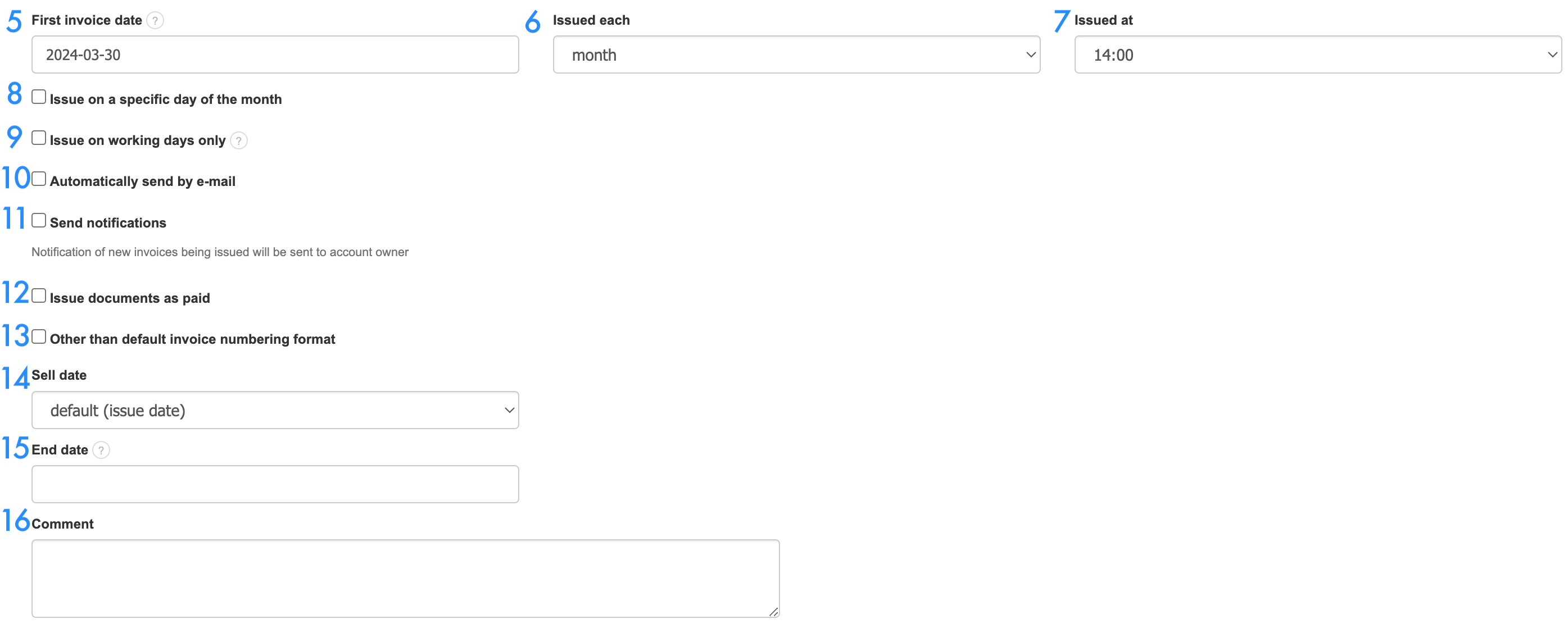 8. Issue on a specific day of the month: you have the option to specify a specific, fixed day from 1 to 31 throughout the month on which each subsequent recurring invoice will be sent.