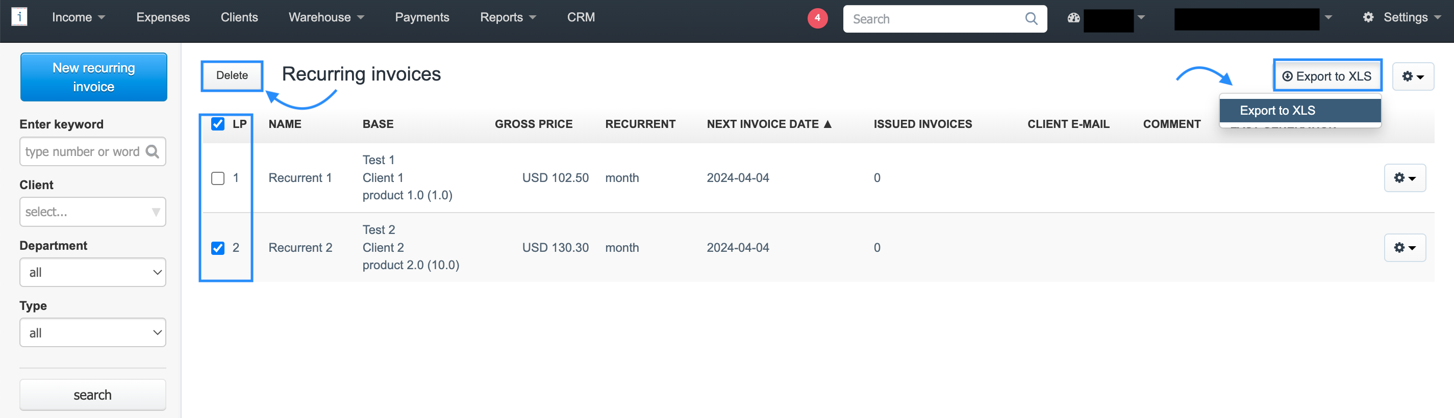 In the menu of the recurring invoices list, you will find the following filters: Enter keyword , Client , Department and Type. These filters will facilitate faster searching for invoice data within cycles.