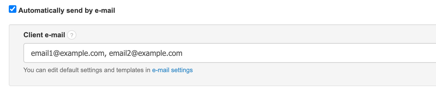 10. Automatically send by e-mail: in the window that appears after selecting this option, you can enter the client's email address to which the program should automatically send the invoices after they are issued. The system allows sending the invoice to up to 5 different email addresses. After each address, use a comma "," eg, email1@example.com , email2@example.com .