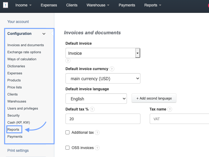 Based on the data from documents added to the system, you can create various reports in InvoiceOcean. Generated reports can show, among other things, revenues and expenses for a specific period, sales for a particular product, or a summary of unpaid invoices. In this article, you will learn where to configure settings related to account reports and statistics and where to find the report database.