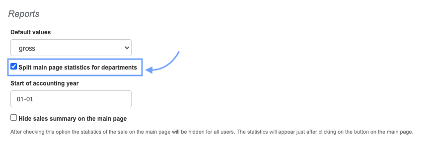 - decide, using the checkbox next to the Split main statistics for departments option, whether the statistics on the main page should include a division into sections