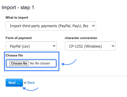 4. Upload the file using the Choose File button and confirm moving to the next step by clicking Next.